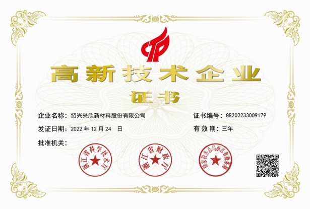 紹興興欣新材料股份有限公司成立于2002年06月27日,占地面積122畝,位于杭州灣上虞經(jīng)濟(jì)技術(shù)開發(fā)區(qū)拓展路2號(hào),現(xiàn)有職工200余人,專業(yè)技術(shù)人員50余人;博士、碩士研究生30余人組成的一支知識(shí)型、專業(yè)化的技術(shù)科研團(tuán)隊(duì)。公司面向全球市場(chǎng),專業(yè)開發(fā)電子化學(xué)品、環(huán)保化學(xué)品、醫(yī)藥中間體、高分子材料等先進(jìn)新材料重點(diǎn)領(lǐng)域的省級(jí)科技型企業(yè);建有浙江上虞、安徽東至兩個(gè)生產(chǎn)基地。目前為“國(guó)家高新技術(shù)企業(yè)”、浙江省“隱形冠軍”企業(yè)、浙江省專精特新中小企業(yè);建有“省級(jí)”研究開發(fā)中心,共建天津大學(xué)浙江紹興研究院電子化學(xué)品研發(fā)中心。